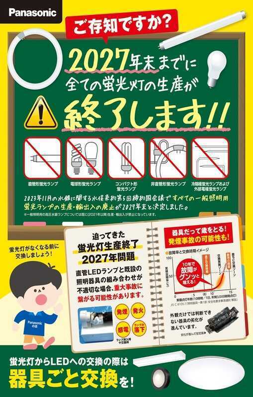 2027年末で蛍光灯の生産は完全終了し、在庫がなくなり次第、蛍光灯の交換は出来なくなります。LED照明なら、省エネで長持ち!まだ蛍光灯をご使用の方は、お早めにLED照明への切り替えをご検討ください。