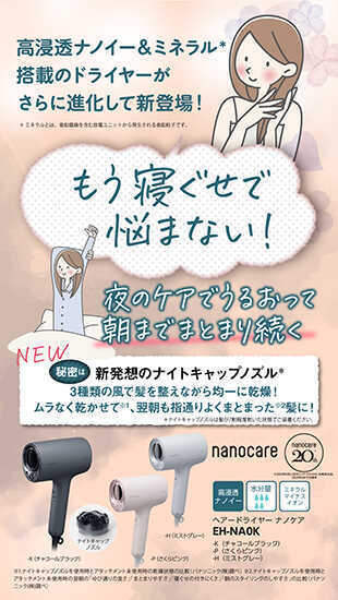 9月発売のパナソニックのドライヤー「EH-NA0K」は、高浸透ナノイー&ミネラル搭載、寝ている間などの髪のこすれによるダメージを抑えてくれます。また、ナノケア史上最大風量を実現、従来よりも髪の毛を速く乾かす事が出来ます。お風呂あがりにゆっくりしたい方や忙しい朝でもしっかり髪のお手入れをしたい方にオススメです。