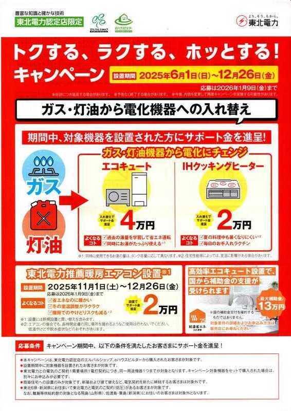 【東北電力トクする、ラクする、ホッとする!キャンペーン】ガス・灯油機器から電化機器への入れ替えでサポート金を進呈!