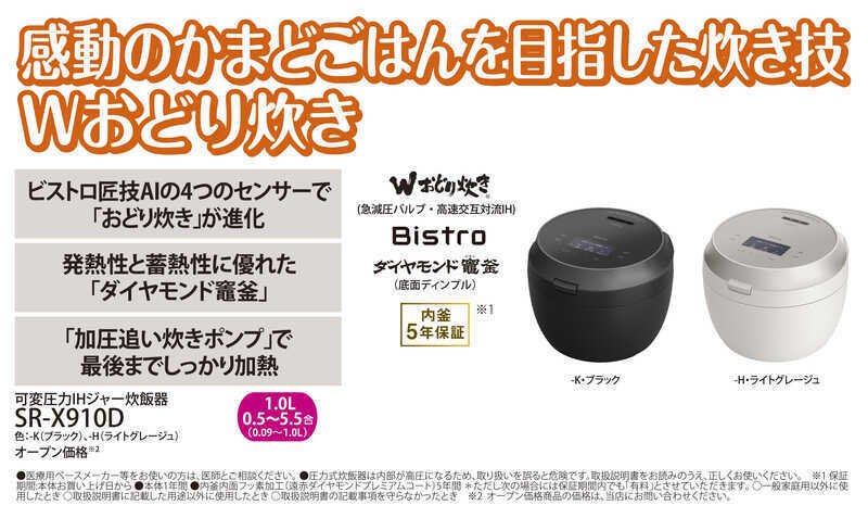 パナソニックの炊飯器X9Dシリーズは、「ビストロ匠技AI」によって、約9,600通りの中から最適な炊き方を導き出し、美味しいお米を炊き上げてくれます。また、「うるおいキープ」機能で、最大30時間まで美味しく保温してくれるので、時間が経ってもべたつきや乾燥の心配がありません。