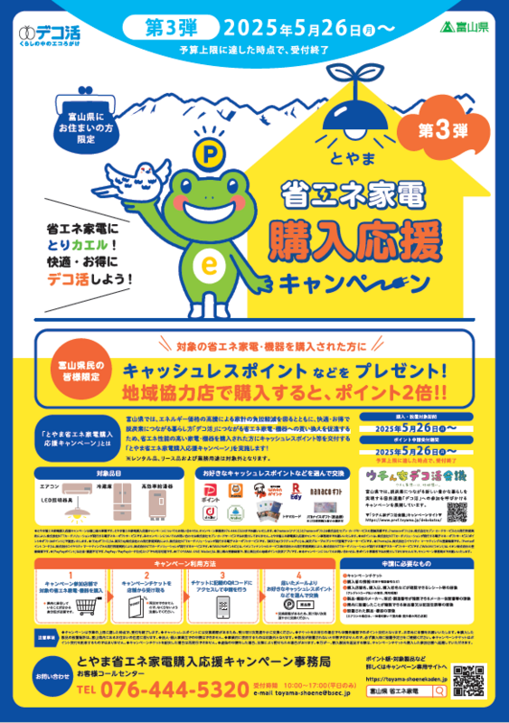 省エネ性能の高い家電・機器を購入された方にキャッシュレスポイント等を交付する「とやま省エネ家電購入応援キャンペーン」を実施しております!