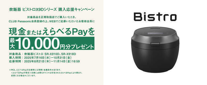 炊飯器キャンペーン、クラブパナソニックへ登録、応募頂きますと新製品のX9タイプの炊飯器に10,000円のキャッシュバック!