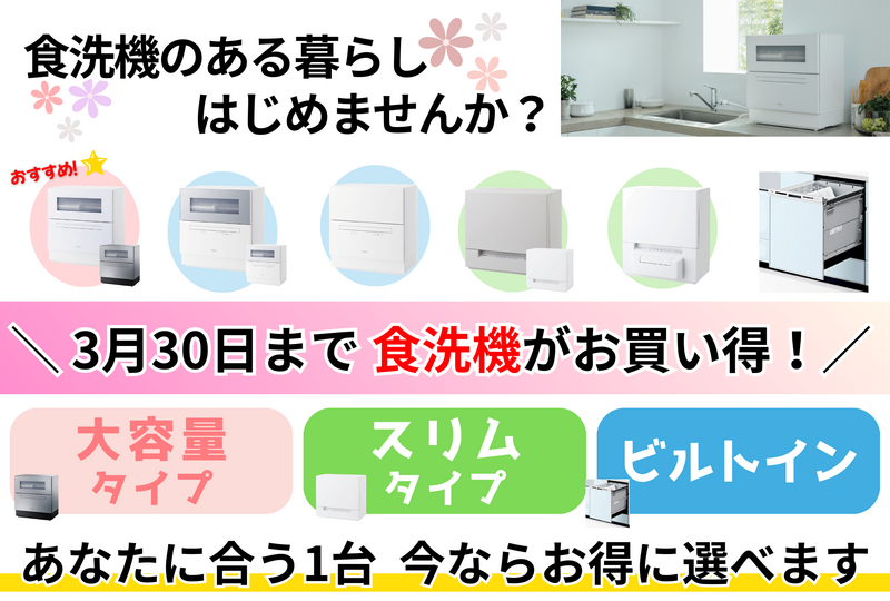 卓上タイプ・ビルトインタイプの食洗機が、今お得になっています。