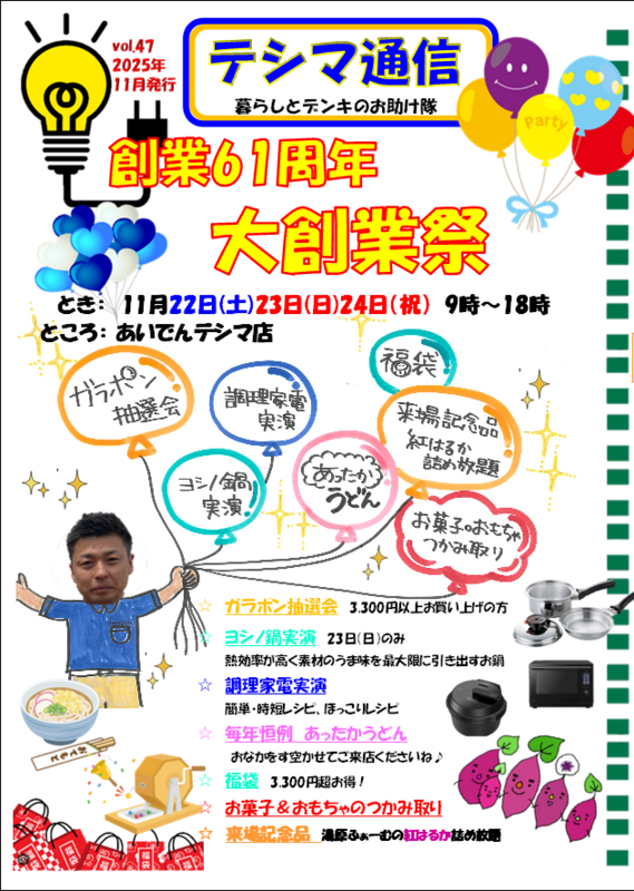 調理家電実演やガラポン、熱伝導良しのヨシノ鍋実演、来場記念品は毎年恒例「紅はるか詰め放題!」