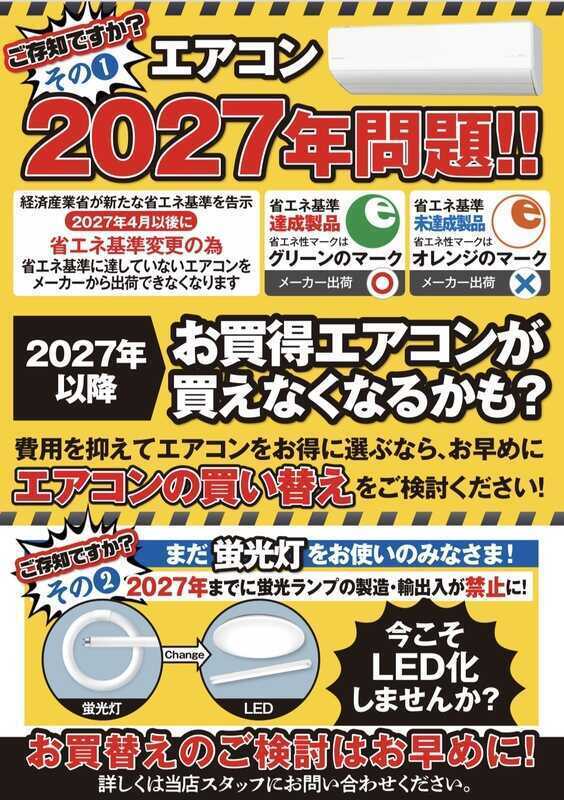 2027年度から家庭用エアコンに適用される省エネ基準が大幅に強化され、現在の基準を満たさないエアコン(安価なスタンダードモデル)の製造・販売が出来なくなります。その結果2027年以降はエアコンの価格が高騰する予測です。こうした問題から今年はエアコンの需要が増え、安価なスタンダードエアコンの品薄や取り付け工事の日程を待って頂く事がありそうです。
