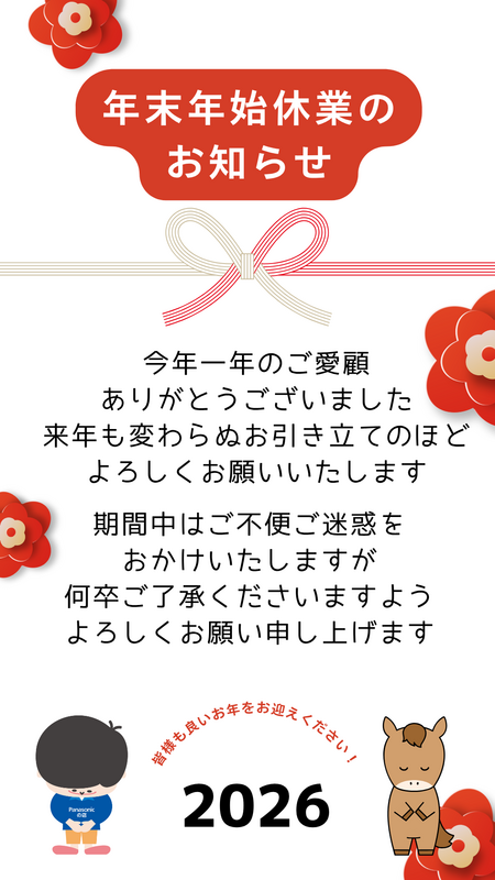 今年も残りわずかとなりました。本年も格別のお引き立てを賜り、厚く御礼申し上げます。来年もよろしくお願い申し上げます。