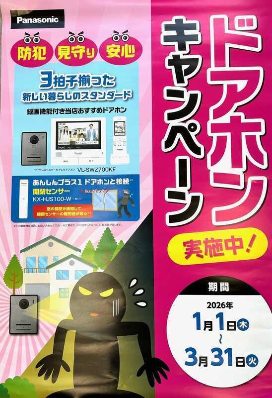 年末年始など強盗が入った、変な人がうろついているとかコワ~いニュース映像見たりしますよね?!自分の家は大丈夫と思っていてもまだまだやれることはたくさんあります。玄関は最低限TVドアホンにして防犯レベル上げましょう!これだけでかなりの抑止効果あります。キャンペーン中の間に是非ご検討下さい!!
