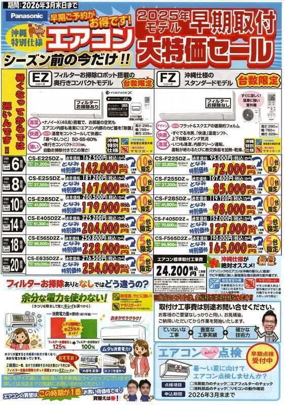 ①全機種沖縄特別モデル②25年過年度モデル台数限定特価あり③省エネ25XZモデルはキャッシュバック対象あり